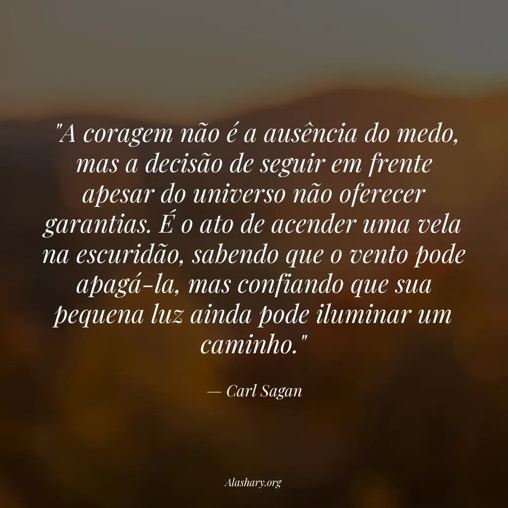 "A coragem não é a ausência do medo, mas a decisão de seguir em frente apesar do universo não oferecer garantias. É o ato de acender uma vela na escuridão, sabendo que o vento pode apagá-la, mas confiando que sua pequena luz ainda pode iluminar um caminho."