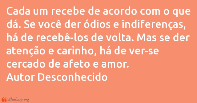 Cada um recebe de acordo com o que dá. Se você der ódios e indiferenças, há de recebê-los de volta. Mas se der atenção e carinho, há de ver-se cercado de afeto e amor.