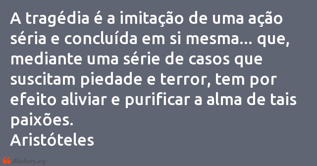 A tragédia é a imitação de uma ação séria e concluída em si mesma... que, mediante uma série de casos que suscitam piedade e terror, tem por efeito aliviar e purificar a alma de tais paixões. Aristóteles