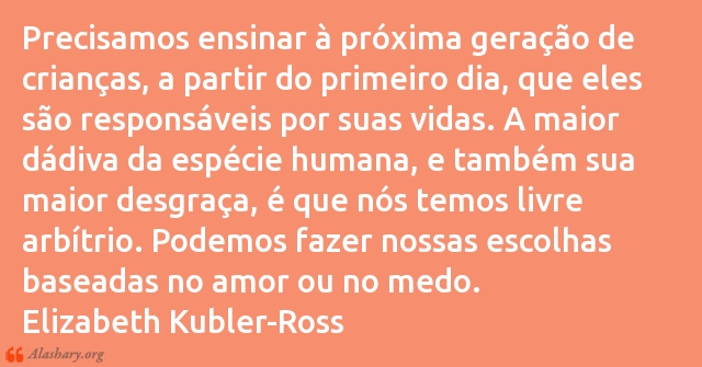 Precisamos ensinar à próxima geração de crianças, a partir do primeiro dia, que eles são responsáveis por suas vidas. A maior dádiva da espécie humana, e também sua maior desgraça, é que nós temos livre arbÃtrio. Podemos fazer nossas escolhas baseadas no amor ou no medo.