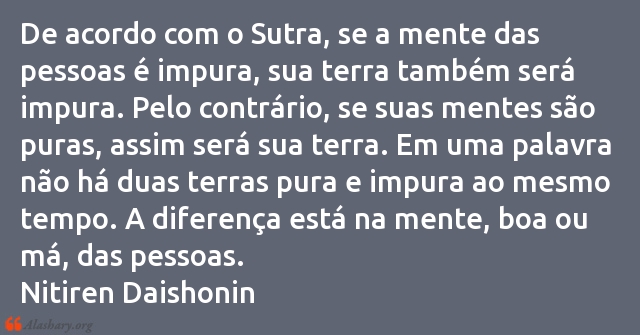 De acordo com o Sutra, se a mente das pessoas é impura, sua terra também será impura. Pelo contrário, se suas mentes são puras, assim será sua terra. Em uma palavra não há duas terras pura e impura ao mesmo tempo. A diferença está na mente, boa ou má, das pessoas.
