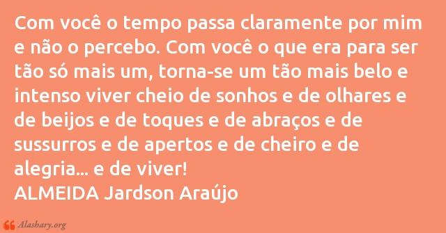 Com você o tempo passa claramente por mim e não o percebo. Com você o que era para ser tão só mais um, torna-se um tão mais belo e intenso viver cheio de sonhos e de olhares e de beijos e de toques e de abraços e de sussurros e de apertos e de cheiro e de alegria... e de viver!