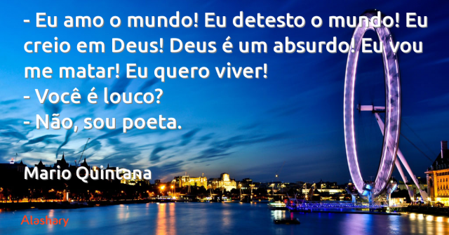 - Eu amo o mundo! Eu detesto o mundo! Eu creio em Deus! Deus é um absurdo! Eu vou me matar! Eu quero viver! - Você é louco? - Não, sou poeta. Mario Quintana