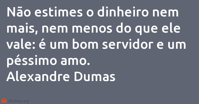 Não estimes o dinheiro nem mais, nem menos do que ele vale: é um bom servidor e um péssimo amo. Alexandre Dumas