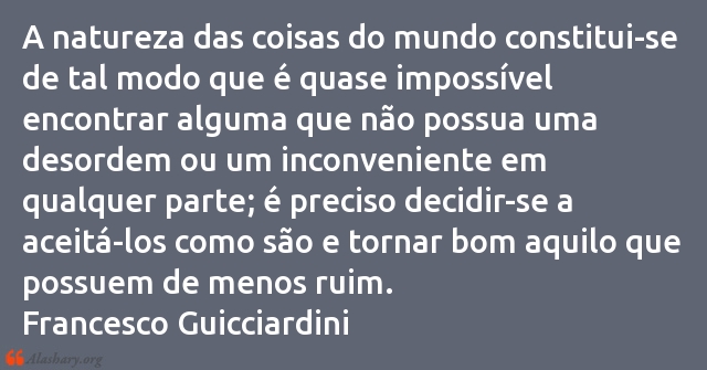A natureza das coisas do mundo constitui-se de tal modo que é quase impossível encontrar alguma que não possua uma desordem ou um inconveniente em qualquer parte; é preciso decidir-se a aceitá-los como são e tornar bom aquilo que possuem de menos ruim.
