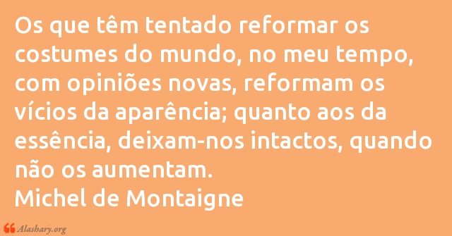 Os que têm tentado reformar os costumes do mundo, no meu tempo, com opiniões novas, reformam os vícios da aparência; quanto aos da essência, deixam-nos intactos, quando não os aumentam.