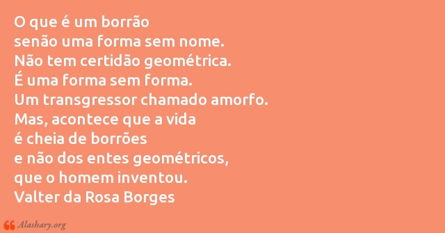 O que é um borrão senão uma forma sem nome. Não tem certidão geométrica. É uma forma sem forma. Um transgressor chamado amorfo. Mas, acontece que a vida é cheia de borrões e não dos entes geométricos, que o homem inventou. Valter da Rosa Borges