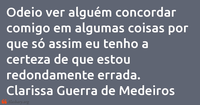 Odeio ver alguém concordar comigo em algumas coisas por que só assim eu tenho a certeza de que estou redondamente errada. Clarissa Guerra de Medeiros