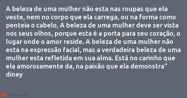A beleza de uma mulher não esta nas roupas que ela veste, nem no corpo que ela carrega, ou na forma como penteia o cabelo, A beleza de uma mulher deve ser vista nos seus olhos, porque esta é a porta para seu coração, o lugar onde o amor reside. A beleza de uma mulher não esta na expressão facial, mas a verdadeira beleza de uma mulher esta refletida em sua alma. Está no carinho que ela amorosamente da, na paixão que ela demonstra"