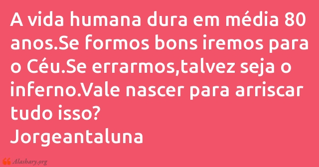 A vida humana dura em média 80 anos.Se formos bons iremos para o Céu.Se errarmos,talvez seja o inferno.Vale nascer para arriscar tudo isso? Jorgeantaluna