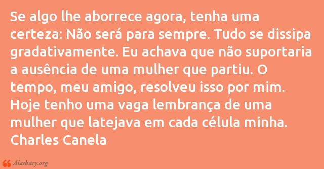 Se algo lhe aborrece agora, tenha uma certeza: Não será para sempre. Tudo se dissipa gradativamente. Eu achava que não suportaria a ausência de uma mulher que partiu. O tempo, meu amigo, resolveu isso por mim. Hoje tenho uma vaga lembrança de uma mulher que latejava em cada célula minha.