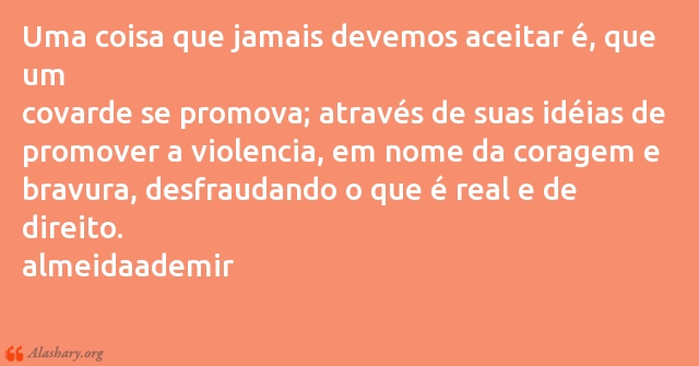 Uma coisa que jamais devemos aceitar é, que um covarde se promova; através de suas idéias de promover a violencia, em nome da coragem e bravura, desfraudando o que é real e de direito. almeidaademir