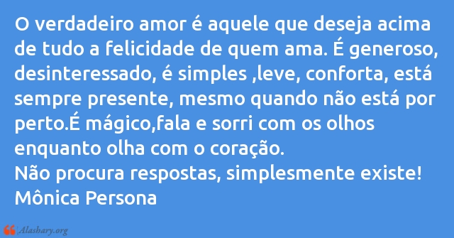 O verdadeiro amor é aquele que deseja acima de tudo a felicidade de quem ama. É generoso, desinteressado, é simples ,leve, conforta, está sempre presente, mesmo quando não está por perto.É mágico,fala e sorri com os olhos enquanto olha com o coração.