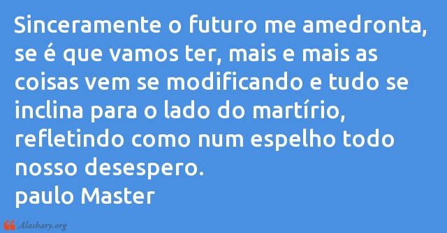Sinceramente o futuro me amedronta, se é que vamos ter, mais e mais as coisas vem se modificando e tudo se inclina para o lado do martírio, refletindo como num espelho todo nosso desespero.