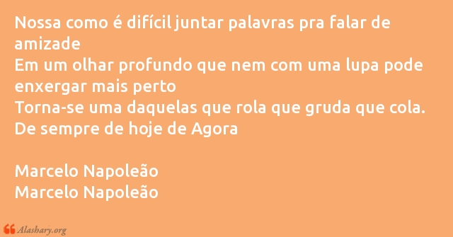 Nossa como é difícil juntar palavras pra falar de amizade Em um olhar profundo que nem com uma lupa pode enxergar mais perto Torna-se uma daquelas que rola que gruda que cola. De sempre de hoje de Agora Marcelo Napoleão