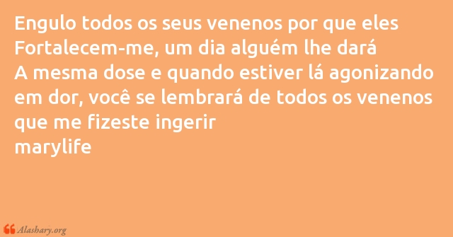 Engulo todos os seus venenos por que eles Fortalecem-me, um dia alguém lhe dará A mesma dose e quando estiver lá agonizando em dor, você se lembrará de todos os venenos que me fizeste ingerir marylife