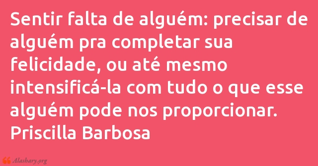 Sentir falta de alguém: precisar de alguém pra completar sua felicidade, ou até mesmo intensificá-la com tudo o que esse alguém pode nos proporcionar. Priscilla Barbosa