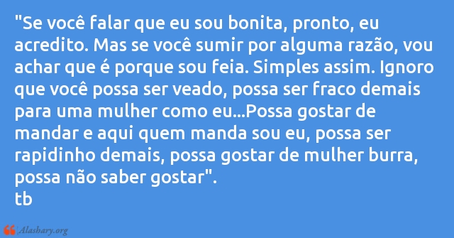 "Se você falar que eu sou bonita, pronto, eu acredito. Mas se você sumir por alguma razão, vou achar que é porque sou feia. Simples assim. Ignoro que você possa ser veado, possa ser fraco demais para uma mulher como eu...Possa gostar de mandar e aqui quem manda sou eu, possa ser rapidinho demais, possa gostar de mulher burra, possa não saber gostar".