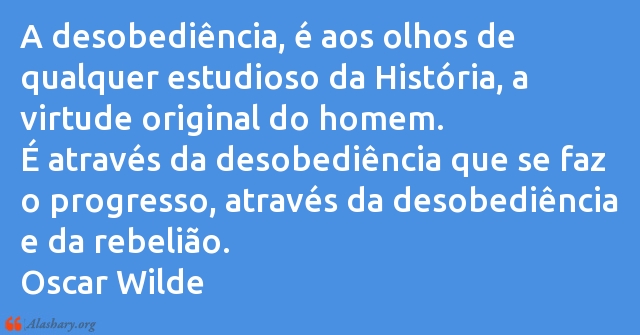 A desobediência, é aos olhos de qualquer estudioso da História, a virtude original do homem. É através da desobediência que se faz o progresso, através da desobediência e da rebelião. Oscar Wilde