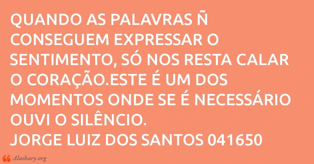 QUANDO AS PALAVRAS Ñ CONSEGUEM EXPRESSAR O SENTIMENTO, SÓ NOS RESTA CALAR O CORAÇÃO.ESTE É UM DOS MOMENTOS ONDE SE É NECESSÁRIO OUVI O SILÊNCIO. JORGE LUIZ DOS SANTOS 041650