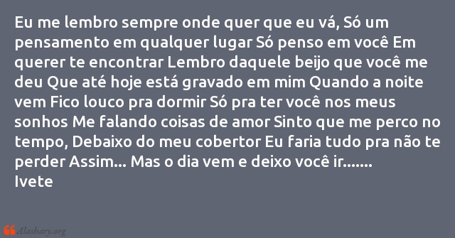 Eu me lembro sempre onde quer que eu vá, Só um pensamento em qualquer lugar Só penso em você Em querer te encontrar Lembro daquele beijo que você me deu Que até hoje está gravado em mim Quando a noite vem Fico louco pra dormir Só pra ter você nos meus sonhos Me falando coisas de amor Sinto que me perco no tempo, Debaixo do meu cobertor Eu faria tudo pra não te perder Assim... Mas o dia vem e deixo você ir.......
