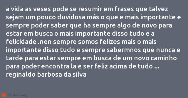 a vida as veses pode se resumir em frases que talvez sejam um pouco duvidosa más o que e mais importante e sempre poder saber que ha sempre algo de novo para estar em busca o mais importante disso tudo e a felicidade .nen sempre somos felizes mais o mais importante disso tudo e sempre sabermnos que nunca e tarde para estar sempre em busca de um novo caminho para poder encontra la e ser feliz acima de tudo ...