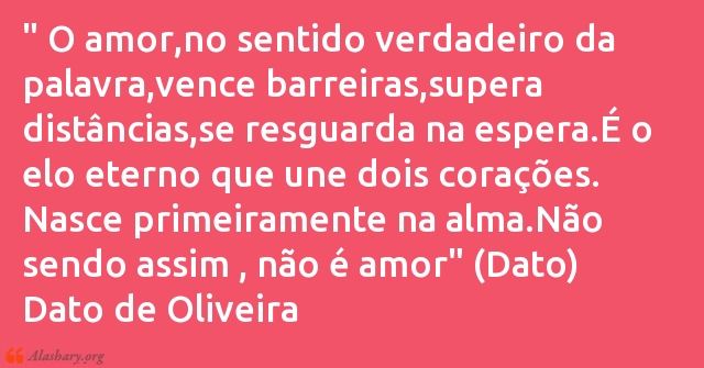 " O amor,no sentido verdadeiro da palavra,vence barreiras,supera distâncias,se resguarda na espera.É o elo eterno que une dois corações. Nasce primeiramente na alma.Não sendo assim , não é amor" (Dato)