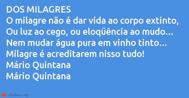 DOS MILAGRES O milagre não é dar vida ao corpo extinto, Ou luz ao cego, ou eloqüência ao mudo... Nem mudar água pura em vinho tinto... Milagre é acreditarem nisso tudo! Mário Quintana