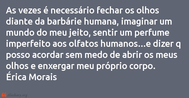 As vezes é necessário fechar os olhos diante da barbárie humana, imaginar um mundo do meu jeito, sentir um perfume imperfeito aos olfatos humanos...e dizer q posso acordar sem medo de abrir os meus olhos e enxergar meu próprio corpo.