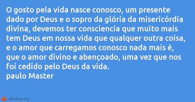 O gosto pela vida nasce conosco, um presente dado por Deus e o sopro da glória da misericórdia divina, devemos ter consciencia que muito mais tem Deus em nossa vida que qualquer outra coisa, e o amor que carregamos conosco nada mais é, que o amor divino e abençoado, uma vez que nos foi cedido pelo Deus da vida.