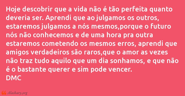Hoje descobrir que a vida não é tão perfeita quanto deveria ser. Aprendi que ao julgamos os outros, estaremos julgamos a nós mesmos,porque o futuro nós não conhecemos e de uma hora pra outra estaremos cometendo os mesmos erros, aprendi que amigos verdadeiros são raros,que o amor as vezes não traz tudo aquilo que um dia sonhamos, e que não é o bastante querer e sim pode vencer.