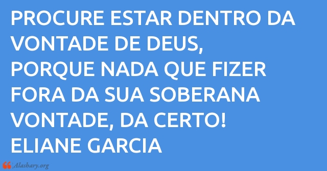PROCURE ESTAR DENTRO DA VONTADE DE DEUS, PORQUE NADA QUE FIZER FORA DA SUA SOBERANA VONTADE, DA CERTO! ELIANE GARCIA