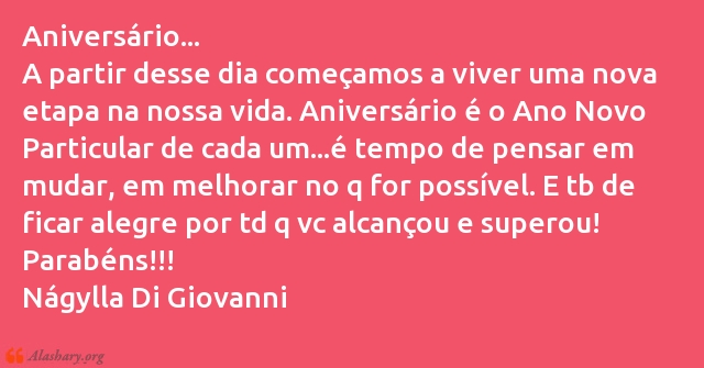 A partir desse dia começamos a viver uma nova etapa na nossa vida. Aniversário é o Ano Novo Particular de cada um...é tempo de pensar em mudar, em melhorar no q for possível. E tb de ficar alegre por td q vc alcançou e superou!