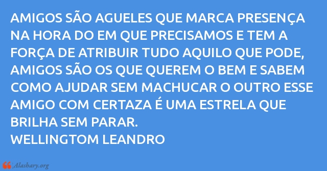 AMIGOS SÃO AGUELES QUE MARCA PRESENÇA NA HORA DO EM QUE PRECISAMOS E TEM A FORÇA DE ATRIBUIR TUDO AQUILO QUE PODE, AMIGOS SÃO OS QUE QUEREM O BEM E SABEM COMO AJUDAR SEM MACHUCAR O OUTRO ESSE AMIGO COM CERTAZA É UMA ESTRELA QUE BRILHA SEM PARAR.