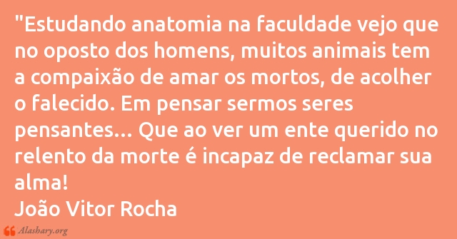 "Estudando anatomia na faculdade vejo que no oposto dos homens, muitos animais tem a compaixão de amar os mortos, de acolher o falecido. Em pensar sermos seres pensantes... Que ao ver um ente querido no relento da morte é incapaz de reclamar sua alma!