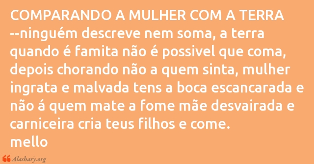 COMPARANDO A MULHER COM A TERRA --ninguém descreve nem soma, a terra quando é famita não é possivel que coma, depois chorando não a quem sinta, mulher ingrata e malvada tens a boca escancarada e não á quem mate a fome mãe desvairada e carniceira cria teus filhos e come.