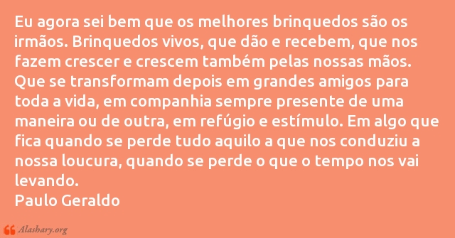 Eu agora sei bem que os melhores brinquedos são os irmãos. Brinquedos vivos, que dão e recebem, que nos fazem crescer e crescem também pelas nossas mãos. Que se transformam depois em grandes amigos para toda a vida, em companhia sempre presente de uma maneira ou de outra, em refúgio e estímulo. Em algo que fica quando se perde tudo aquilo a que nos conduziu a nossa loucura, quando se perde o que o tempo nos vai levando.