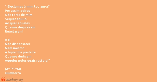 "-Declamas à mim teu amor? Por assim agires Não terás de mim Sequer aquilo Ao qual aqueles Que me desprezam Rejeitaram! À tí Não dispensarei Nem mesmo A hipócrita piedade Que me dedicam Aqueles pelos quais rastejo!" (A*T*P*M) Humberto