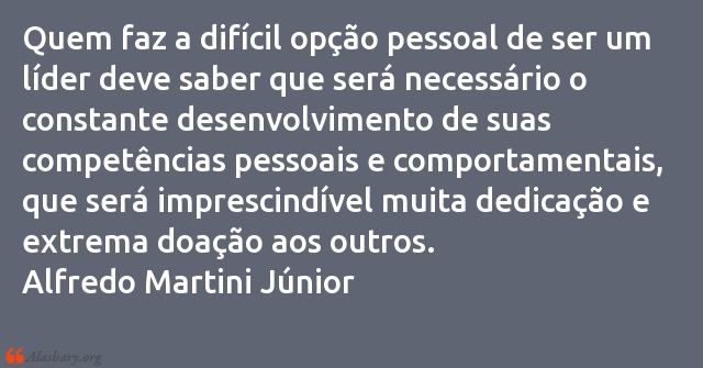 Quem faz a difícil opção pessoal de ser um líder deve saber que será necessário o constante desenvolvimento de suas competências pessoais e comportamentais, que será imprescindível muita dedicação e extrema doação aos outros. Alfredo Martini Júnior