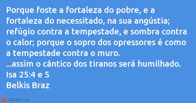 Porque foste a fortaleza do pobre, e a fortaleza do necessitado, na sua angústia; refúgio contra a tempestade, e sombra contra o calor; porque o sopro dos opressores é como a tempestade contra o muro.