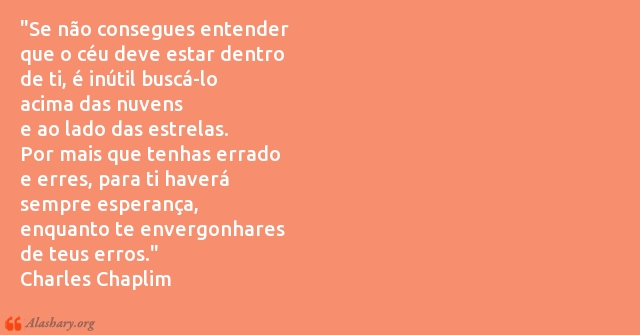 "Se não consegues entender que o céu deve estar dentro de ti, é inútil buscá-lo acima das nuvens e ao lado das estrelas. Por mais que tenhas errado e erres, para ti haverá sempre esperança, enquanto te envergonhares de teus erros." Charles Chaplim