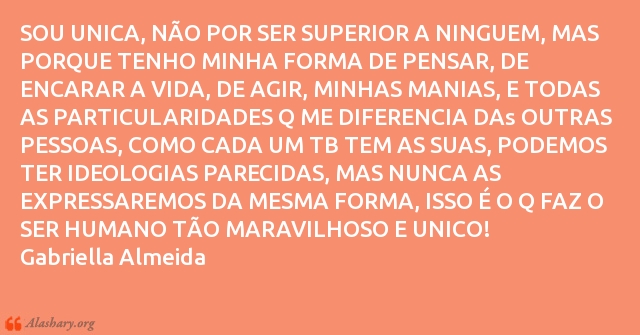 SOU UNICA, NÃO POR SER SUPERIOR A NINGUEM, MAS PORQUE TENHO MINHA FORMA DE PENSAR, DE ENCARAR A VIDA, DE AGIR, MINHAS MANIAS, E TODAS AS PARTICULARIDADES Q ME DIFERENCIA DAs OUTRAS PESSOAS, COMO CADA UM TB TEM AS SUAS, PODEMOS TER IDEOLOGIAS PARECIDAS, MAS NUNCA AS EXPRESSAREMOS DA MESMA FORMA, ISSO É O Q FAZ O SER HUMANO TÃO MARAVILHOSO E UNICO!