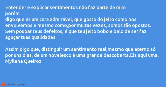 Assim digo que, distinguir um sentimento real,mesmo que eterno só por uns dias, de um novelesco é uma grande descoberta.Eis aqui uma.