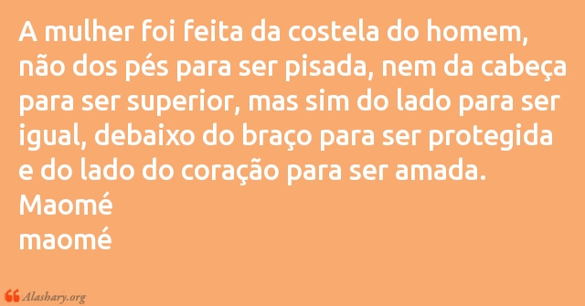 A mulher foi feita da costela do homem, não dos pés para ser pisada, nem da cabeça para ser superior, mas sim do lado para ser igual, debaixo do braço para ser protegida e do lado do coração para ser amada.