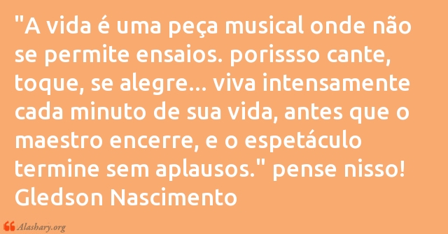 "A vida é uma peça musical onde não se permite ensaios. porissso cante, toque, se alegre... viva intensamente cada minuto de sua vida, antes que o maestro encerre, e o espetáculo termine sem aplausos." pense nisso!