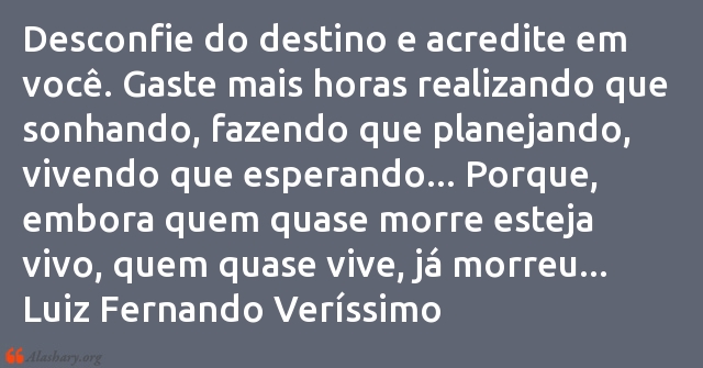 Desconfie do destino e acredite em você. Gaste mais horas realizando que sonhando, fazendo que planejando, vivendo que esperando... Porque, embora quem quase morre esteja vivo, quem quase vive, já morreu... Luiz Fernando Veríssimo