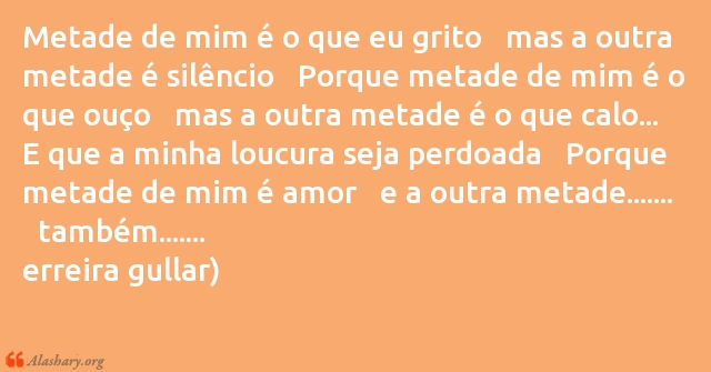 Metade de mim é o que eu grito mas a outra metade é silêncio Porque metade de mim é o que ouço mas a outra metade é o que calo... E que a minha loucura seja perdoada Porque metade de mim é amor e a outra metade.......