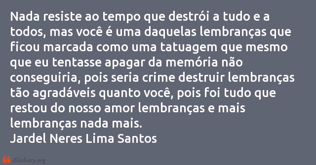 Nada resiste ao tempo que destrói a tudo e a todos, mas você é uma daquelas lembranças que ficou marcada como uma tatuagem que mesmo que eu tentasse apagar da memória não conseguiria, pois seria crime destruir lembranças tão agradáveis quanto você, pois foi tudo que restou do nosso amor lembranças e mais lembranças nada mais.