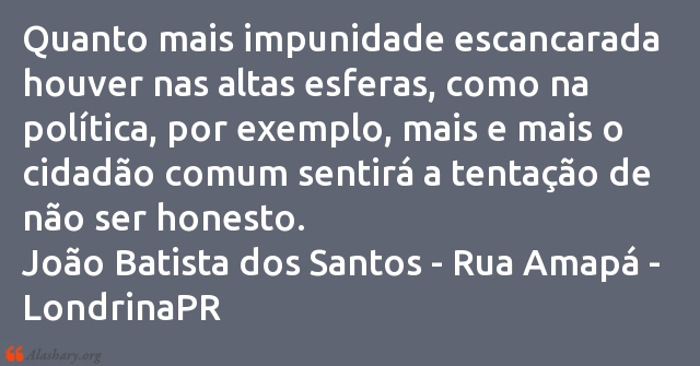 Quanto mais impunidade escancarada houver nas altas esferas, como na política, por exemplo, mais e mais o cidadão comum sentirá a tentação de não ser honesto. João Batista dos Santos - Rua Amapá - LondrinaPR