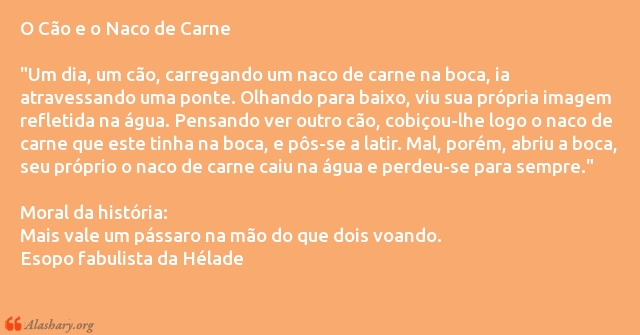 "Um dia, um cão, carregando um naco de carne na boca, ia atravessando uma ponte. Olhando para baixo, viu sua própria imagem refletida na água. Pensando ver outro cão, cobiçou-lhe logo o naco de carne que este tinha na boca, e pôs-se a latir. Mal, porém, abriu a boca, seu próprio o naco de carne caiu na água e perdeu-se para sempre."